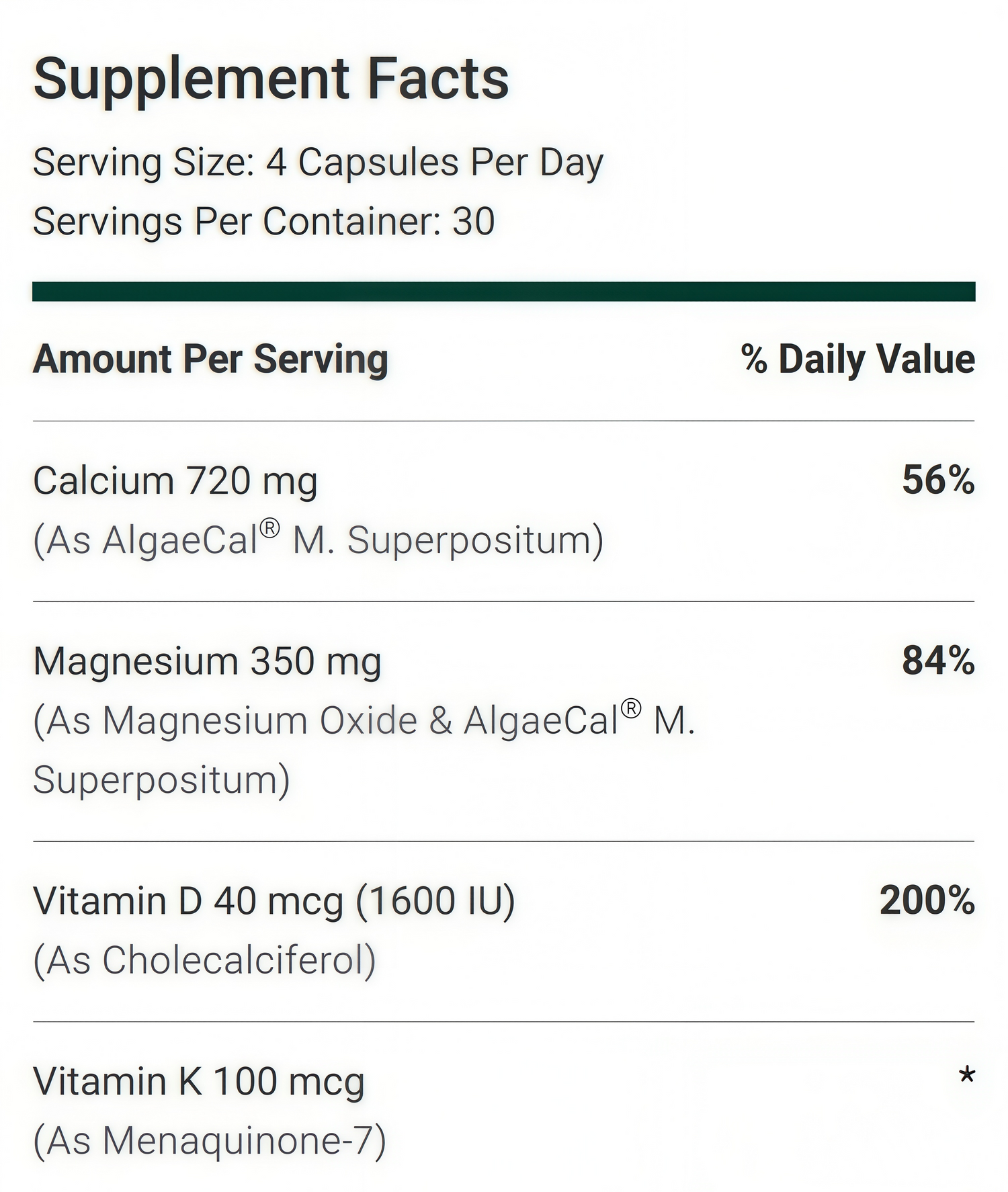 To maximize your bone-building, take 4 capsules of AlgaeCal Plus a day. (This was the dosage that led to the most significant bone density increases in clinical trials).
